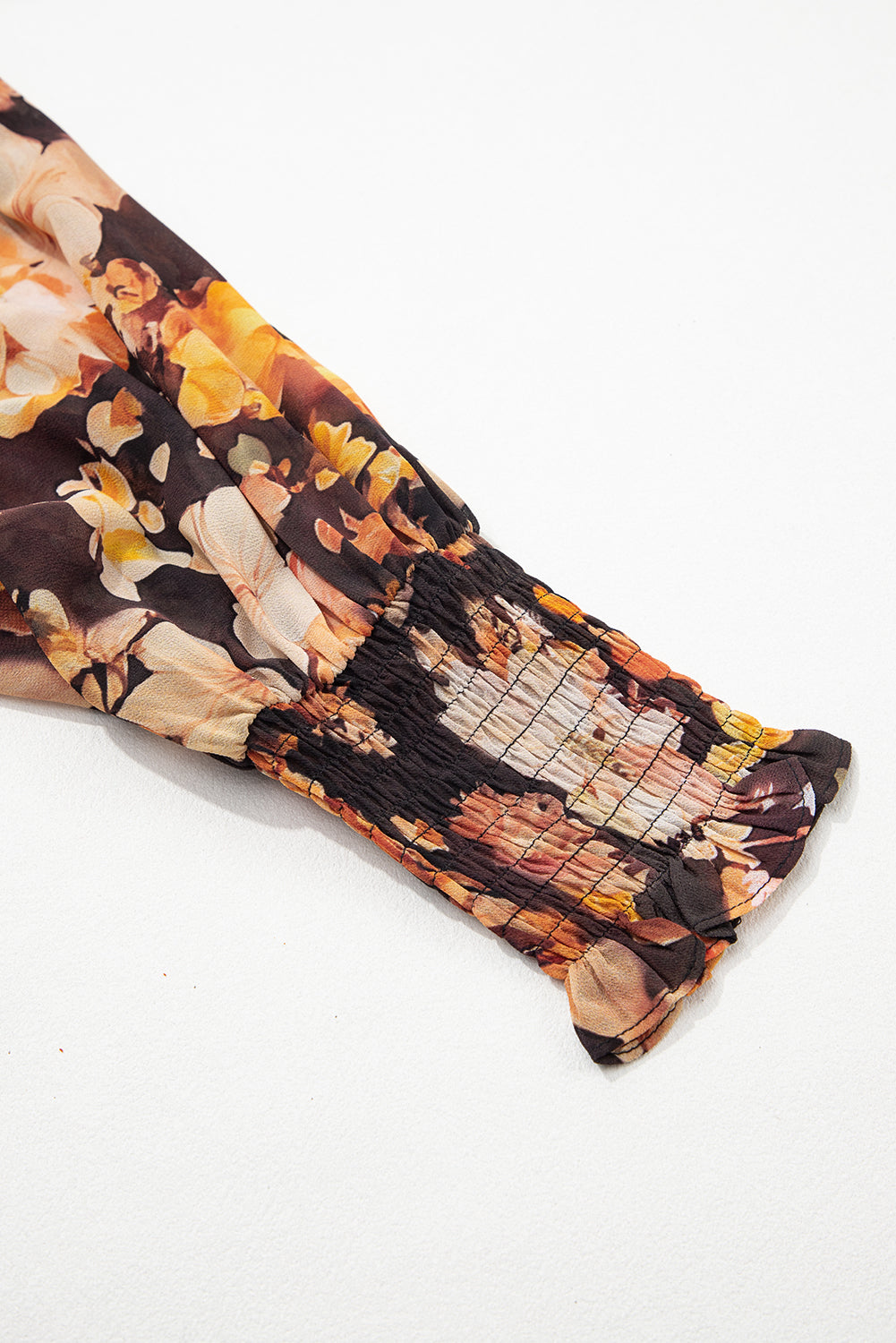 Black Floral V Neck Long Puff Sleeve Breezy Blouse